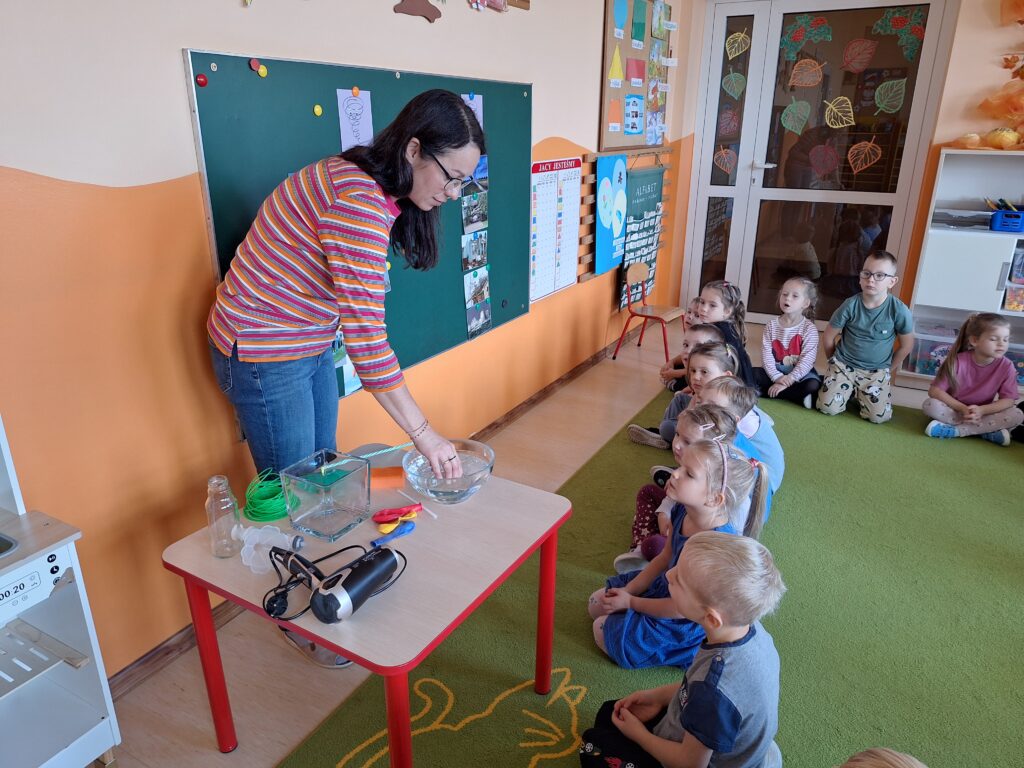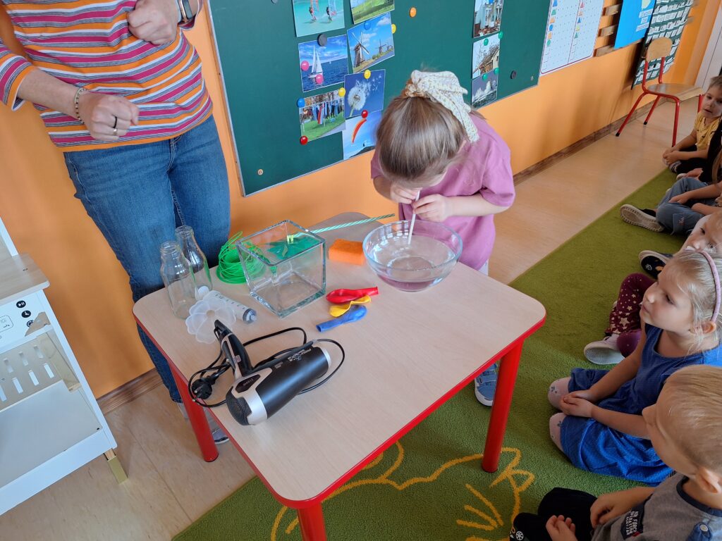 Dzieci poznały żywioł – powietrze. W trakcie zajęć wykonywały różnorodne eksperymenty, dzięki którym mogły zobaczyć, jak powietrze działa w praktyce. Dowiedziały się, że wiatr może być pożyteczny, na przykład wytwarzać energię lub poruszać różne przedmioty, ale także niebezpieczny, gdy staje się bardzo silny. Dzięki tym doświadczeniom dzieci lepiej zrozumiały właściwości powietrza i jego rolę w przyrodzie.