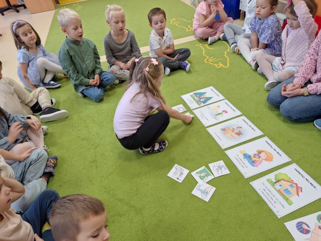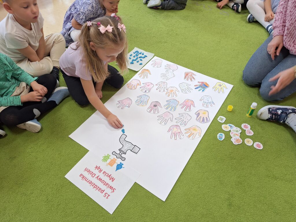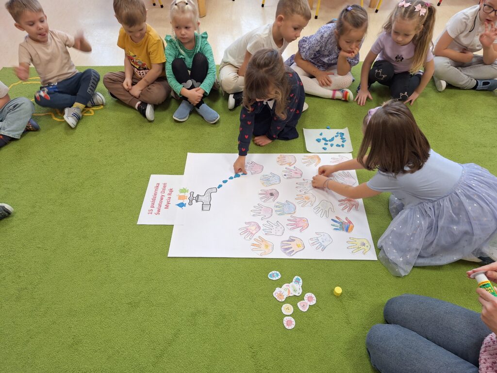 Na zakończenie zajęć dzieci wspólnie wykonały tematyczny plakat, który podsumował zdobytą wiedzę i utrwalił zasady prawidłowej higieny rąk.