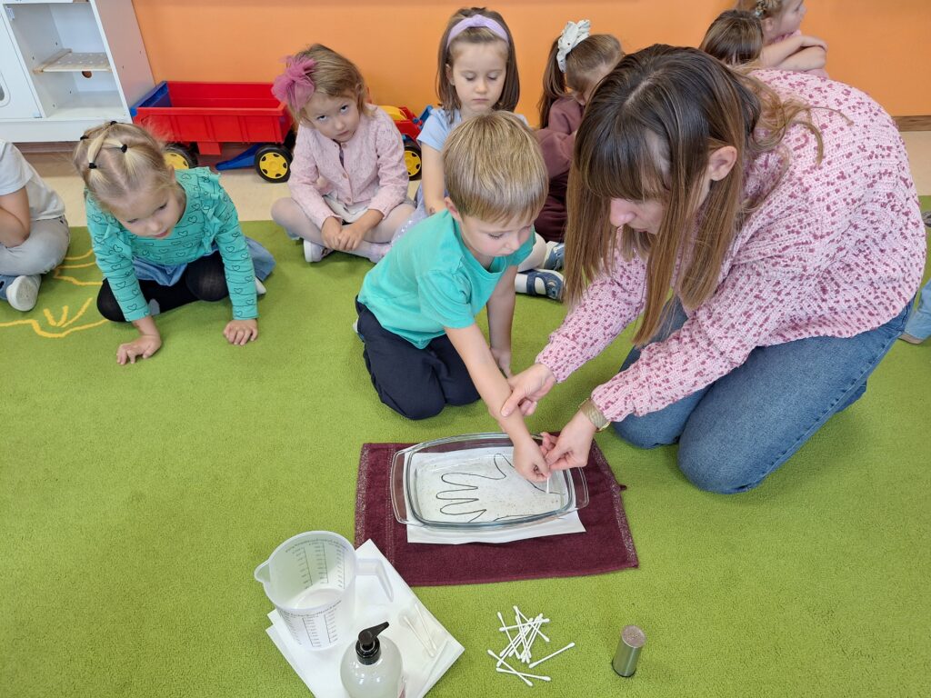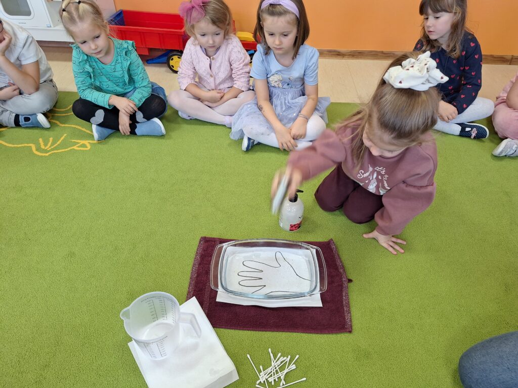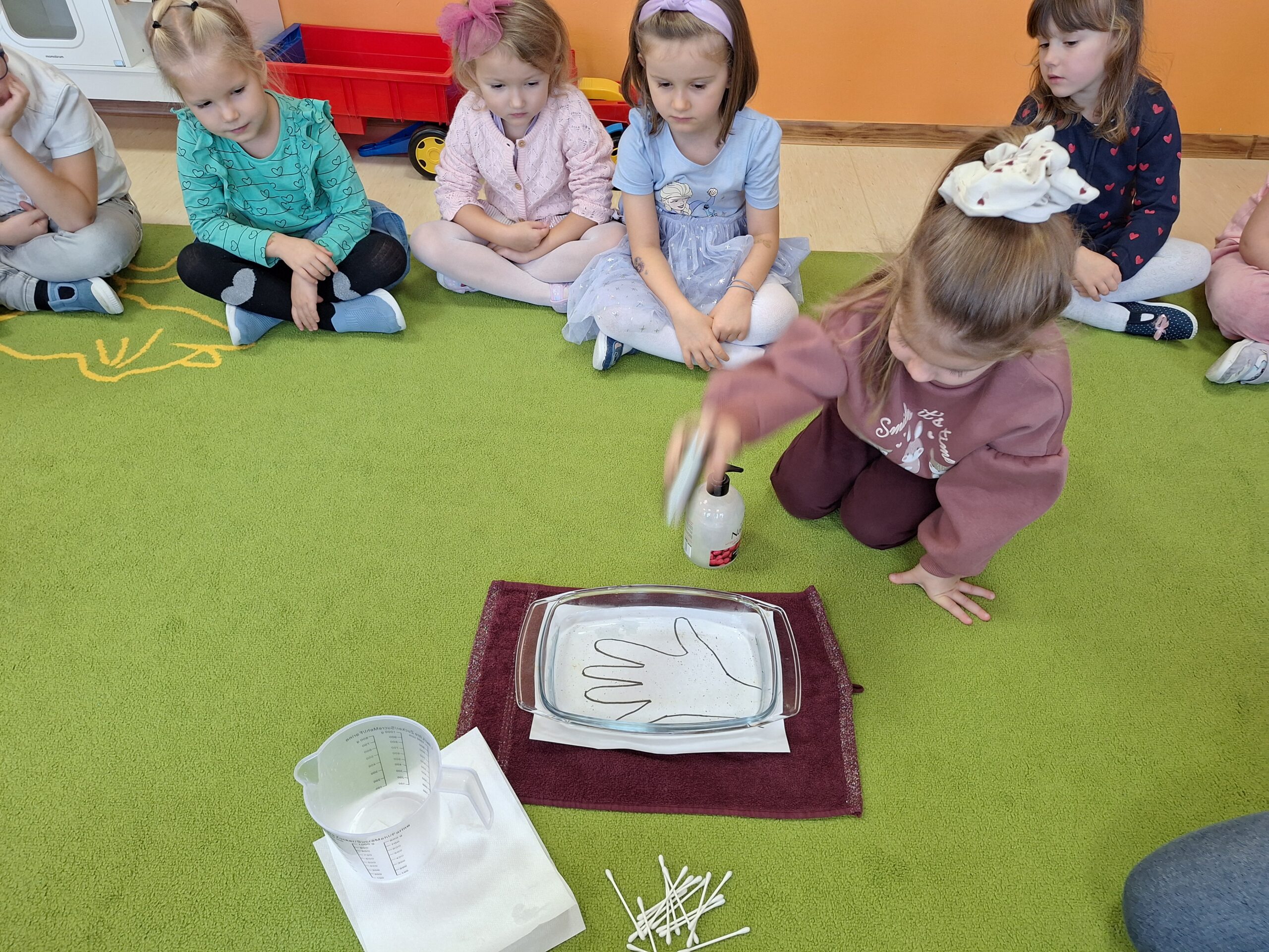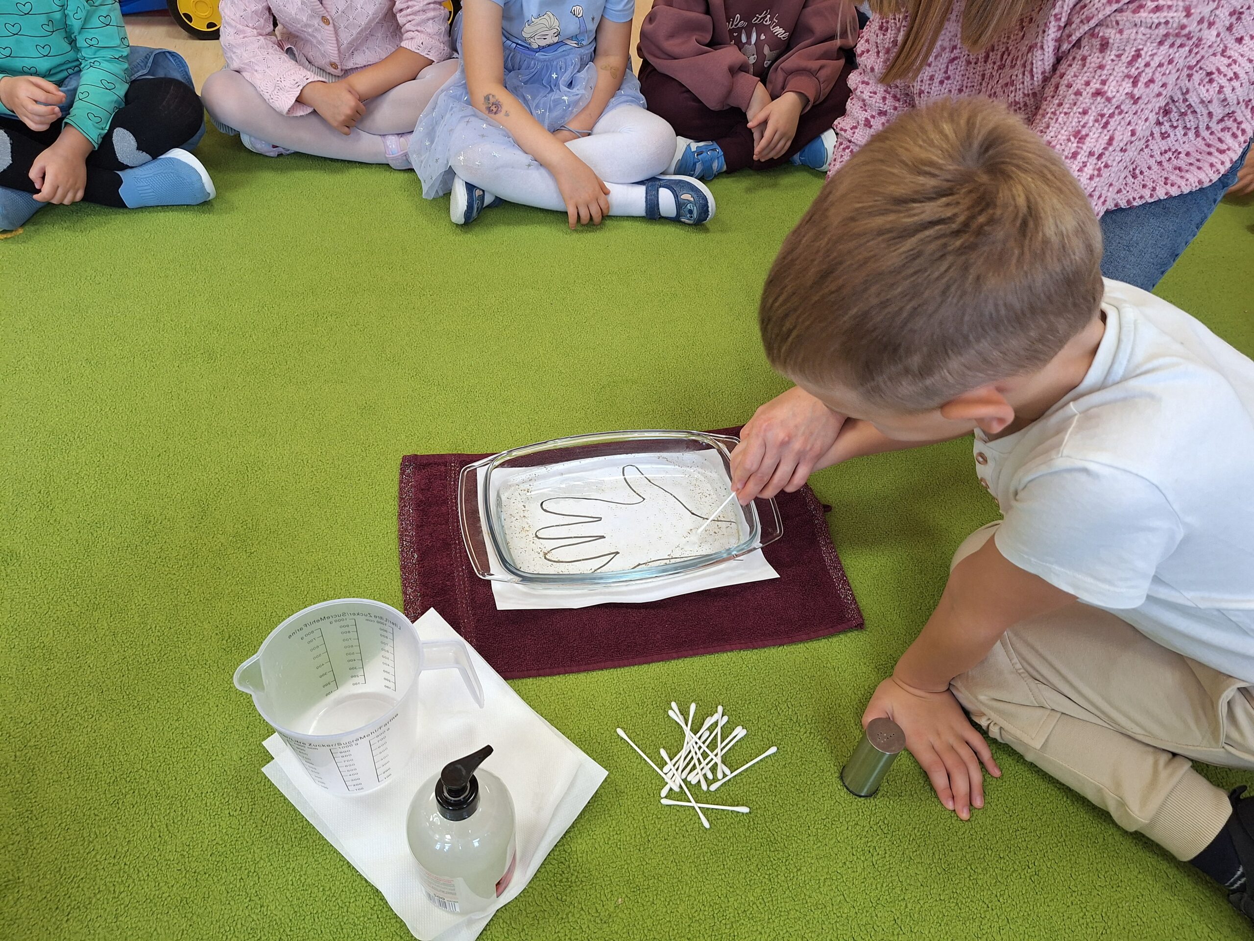W części praktycznej przedszkolaki przeprowadziły ciekawe doświadczenie pokazujące, jak mydło działa na zarazki. Dzięki temu w prosty i zrozumiały sposób mogły zobaczyć, jak ważne jest używanie mydła podczas codziennego mycia rąk.