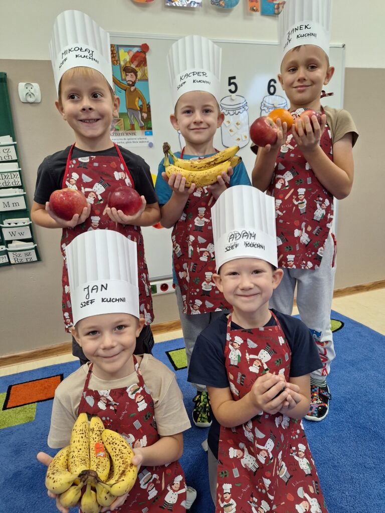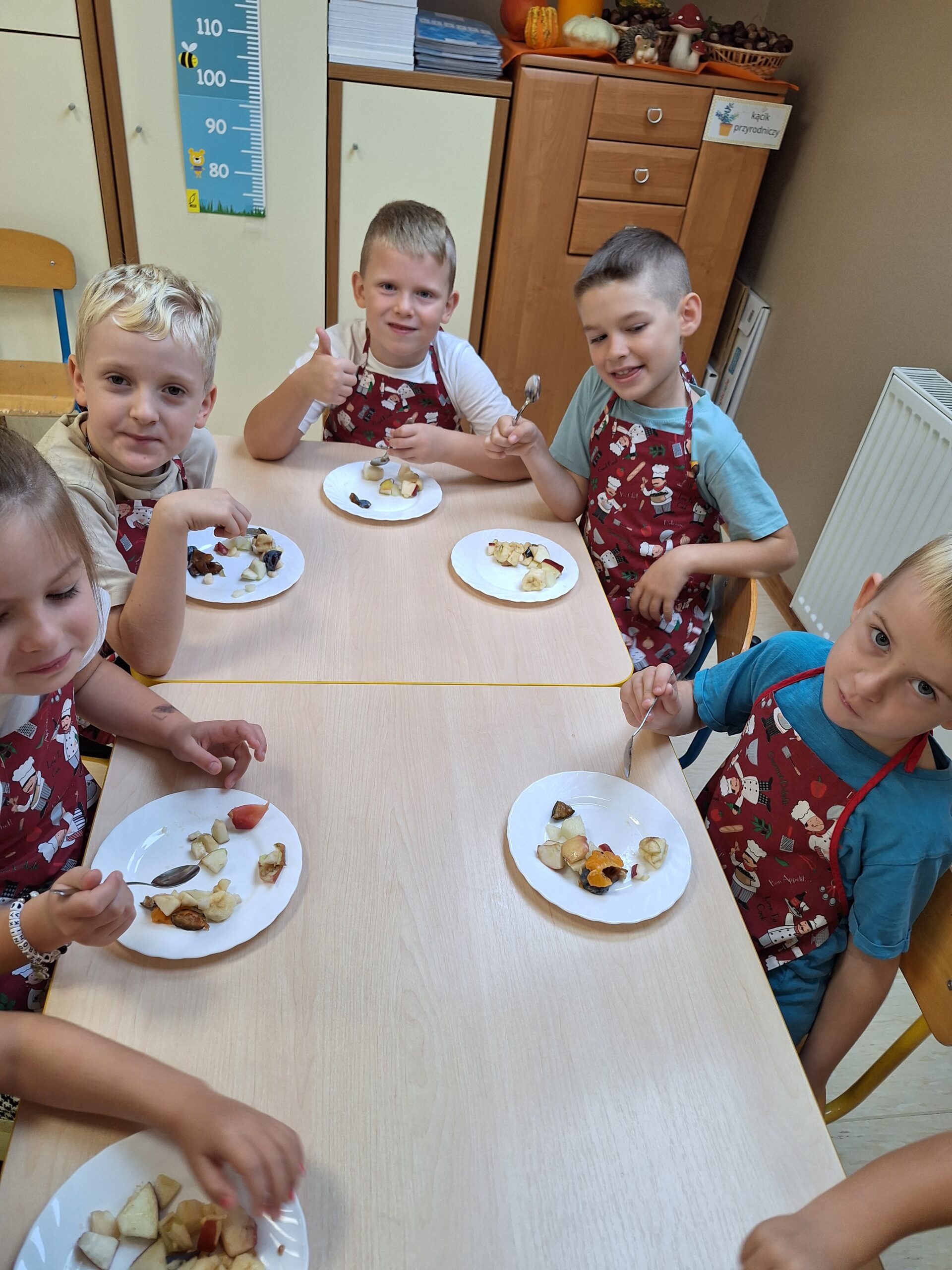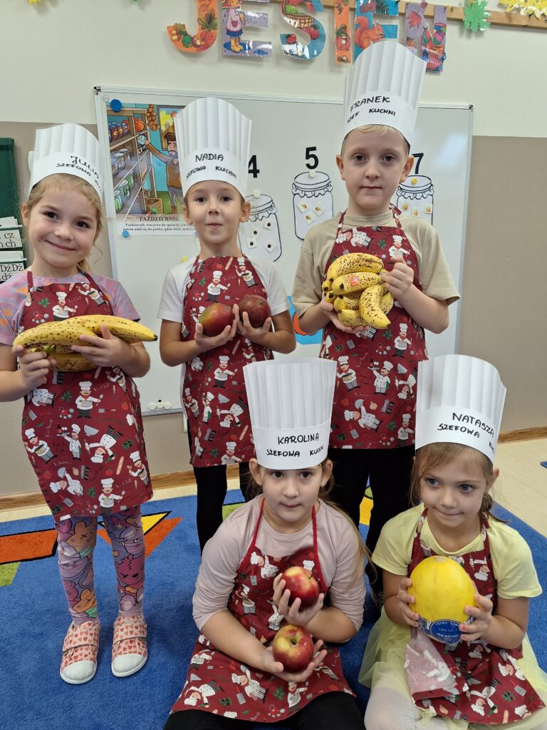 Dzieci z grupy VIII na zajęciach samodzielnie przygotowały pyszną, kolorową i witaminową sałatkę owocową. Przed przystąpieniem do pracy dzieci dokładnie umyły ręce, pamiętając o zasadach higieny. Przedszkolaki pokazały, że potrafią bezpiecznie posługiwać się nożem podczas krojenia owoców na małe kawałki. Przyrządzanie sałatki dało dzieciom wiele satysfakcji, jednocześnie uświadamiając jak ważną rolę odgrywają witaminy we właściwym funkcjonowaniu organizmu. Sałatka udała się, wyszła wspaniale!