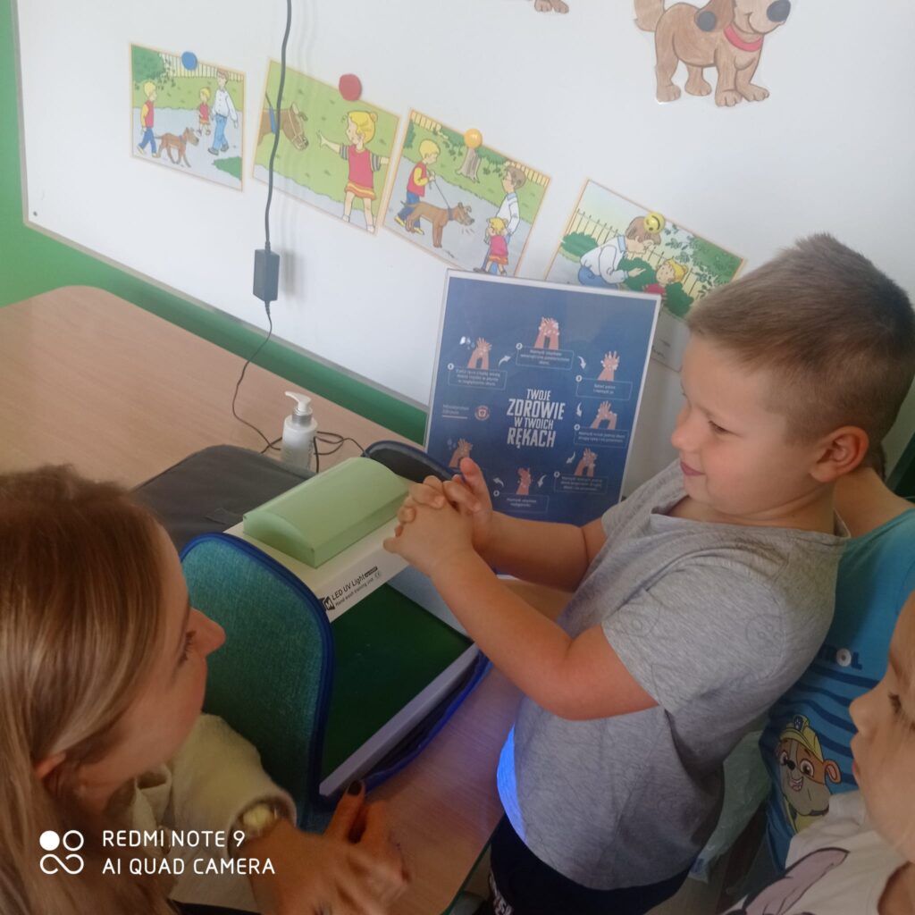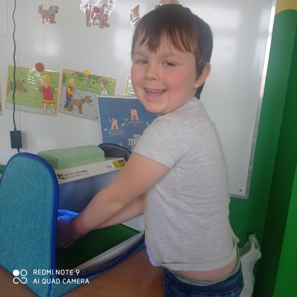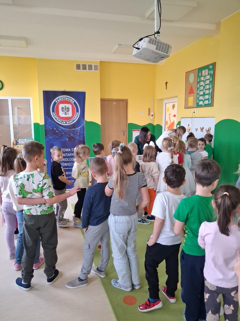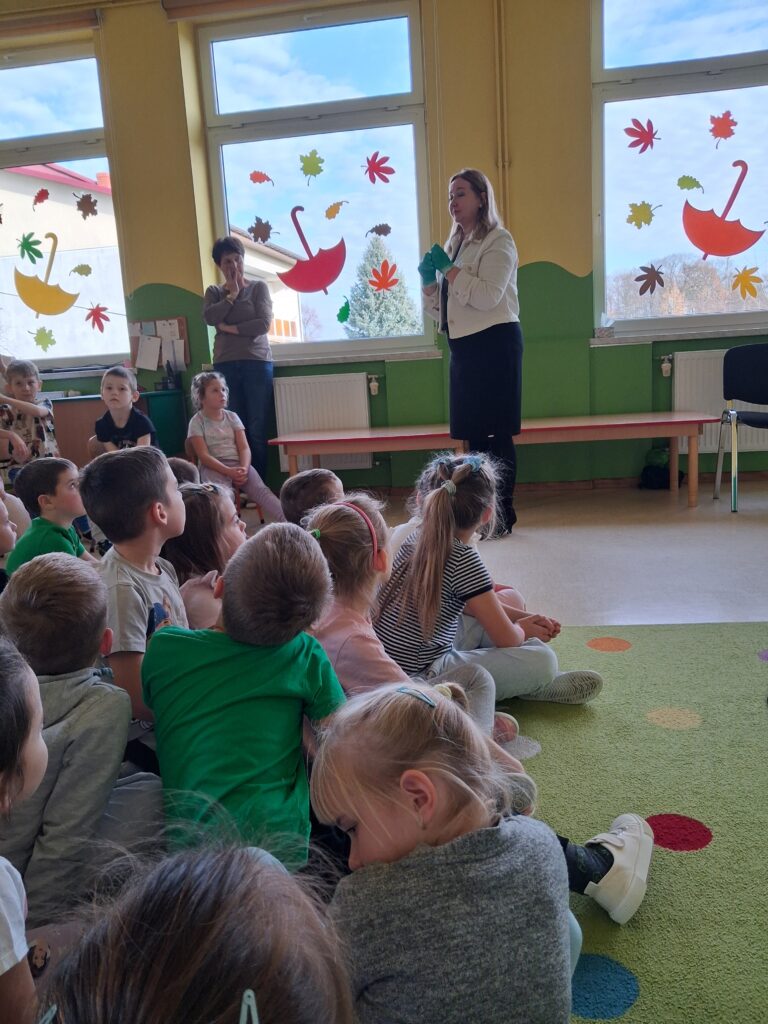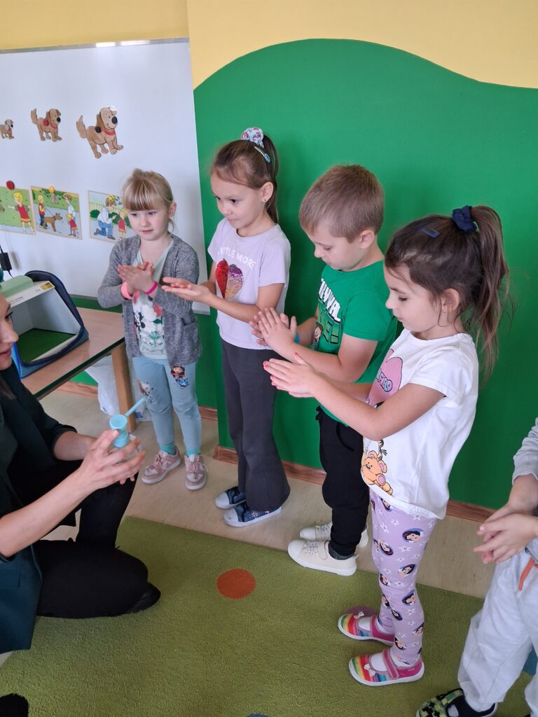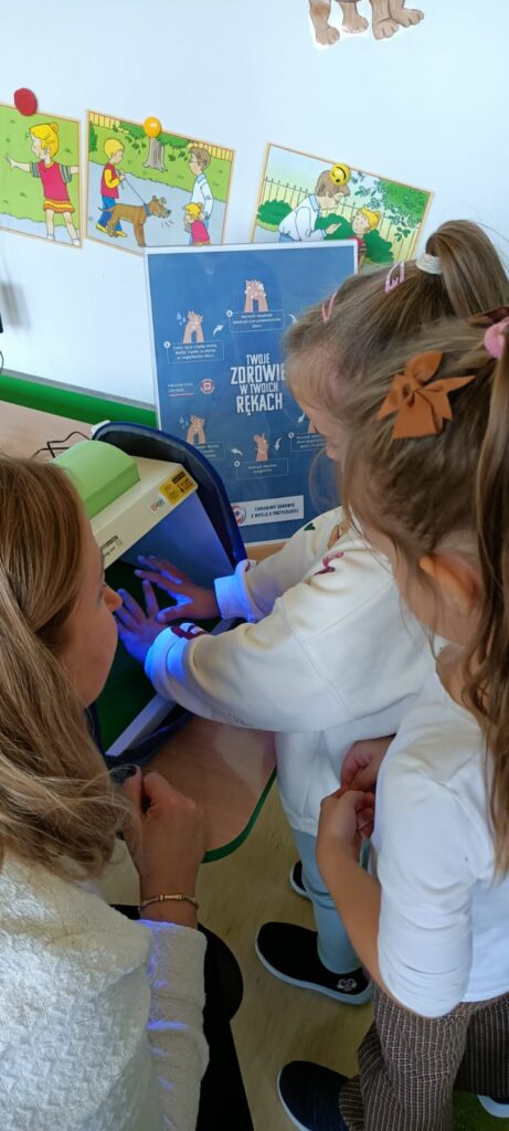 14 listopada dzieci z grup starszych uczestniczyły w zajęciach edukacyjnych przeprowadzonych przez Panie z sanepidu dotyczących higieny rąk oraz zdrowego żywienia. Dzieci miały okazję przypomnieć sobie jak prawidłowo myć ręce oraz sprawdzić- pod specjalną lampą czy zrobiły to dokładnie. To doświadczenie uświadomiło nam, jak starannie trzeba myć ręce, żeby usunąć z nich bakterie. Podczas spotkania, dzieci dowiedziały się także co to jest „Talerz zdrowego żywienia”, dlaczego należy się zdrowo odżywiać, spożywać owoce, warzywa, pełnoziarniste produkty zbożowe oraz białko i tłuszcze. Serdecznie dziękujemy za ciekawe i pouczające spotkanie.