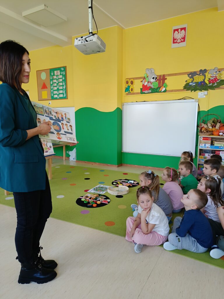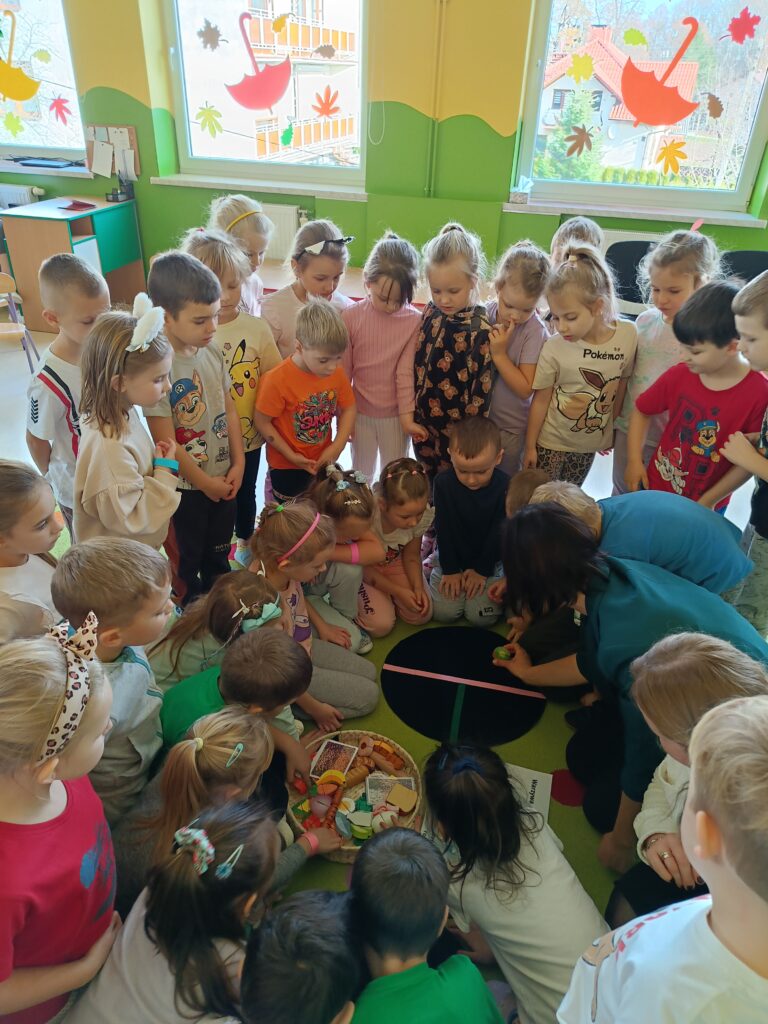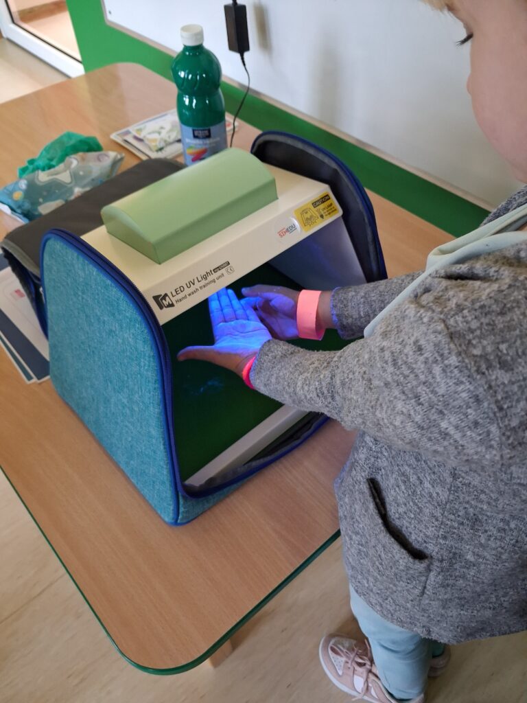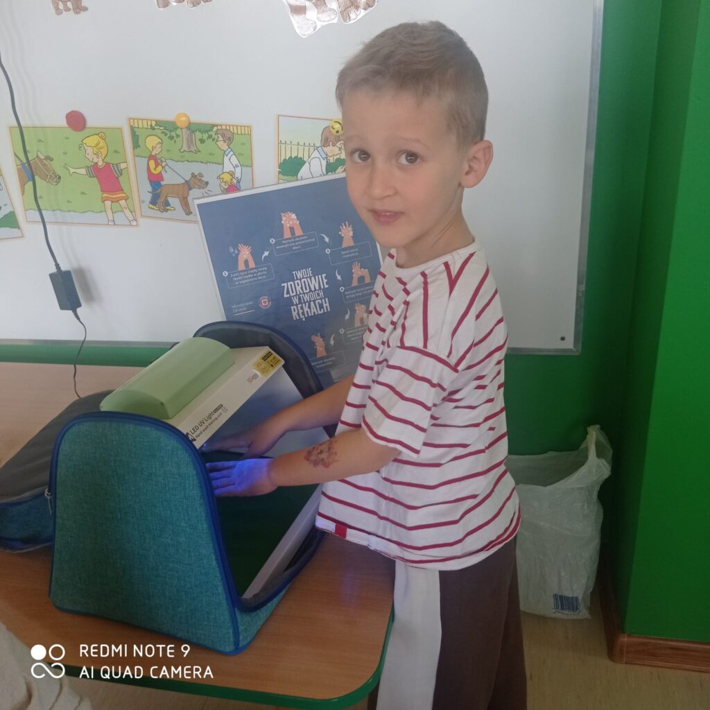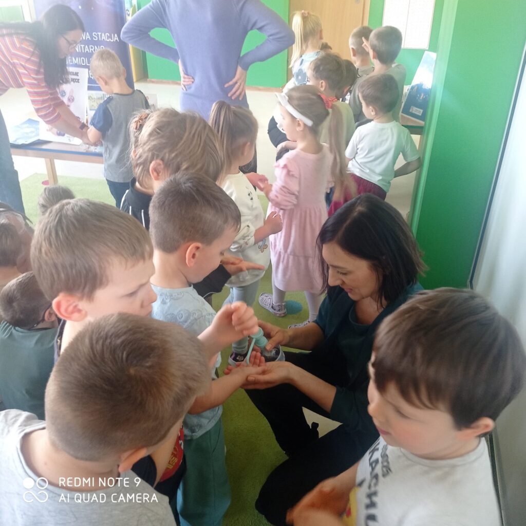 14 listopada dzieci z grup starszych uczestniczyły w zajęciach edukacyjnych przeprowadzonych przez Panie z sanepidu dotyczących higieny rąk oraz zdrowego żywienia. Dzieci miały okazję przypomnieć sobie jak prawidłowo myć ręce oraz sprawdzić- pod specjalną lampą czy zrobiły to dokładnie. To doświadczenie uświadomiło nam, jak starannie trzeba myć ręce, żeby usunąć z nich bakterie. Podczas spotkania, dzieci dowiedziały się także co to jest „Talerz zdrowego żywienia”, dlaczego należy się zdrowo odżywiać, spożywać owoce, warzywa, pełnoziarniste produkty zbożowe oraz białko i tłuszcze. Serdecznie dziękujemy za ciekawe i pouczające spotkanie.