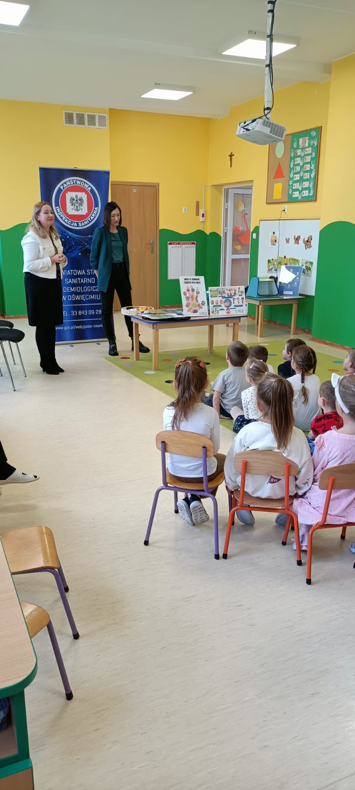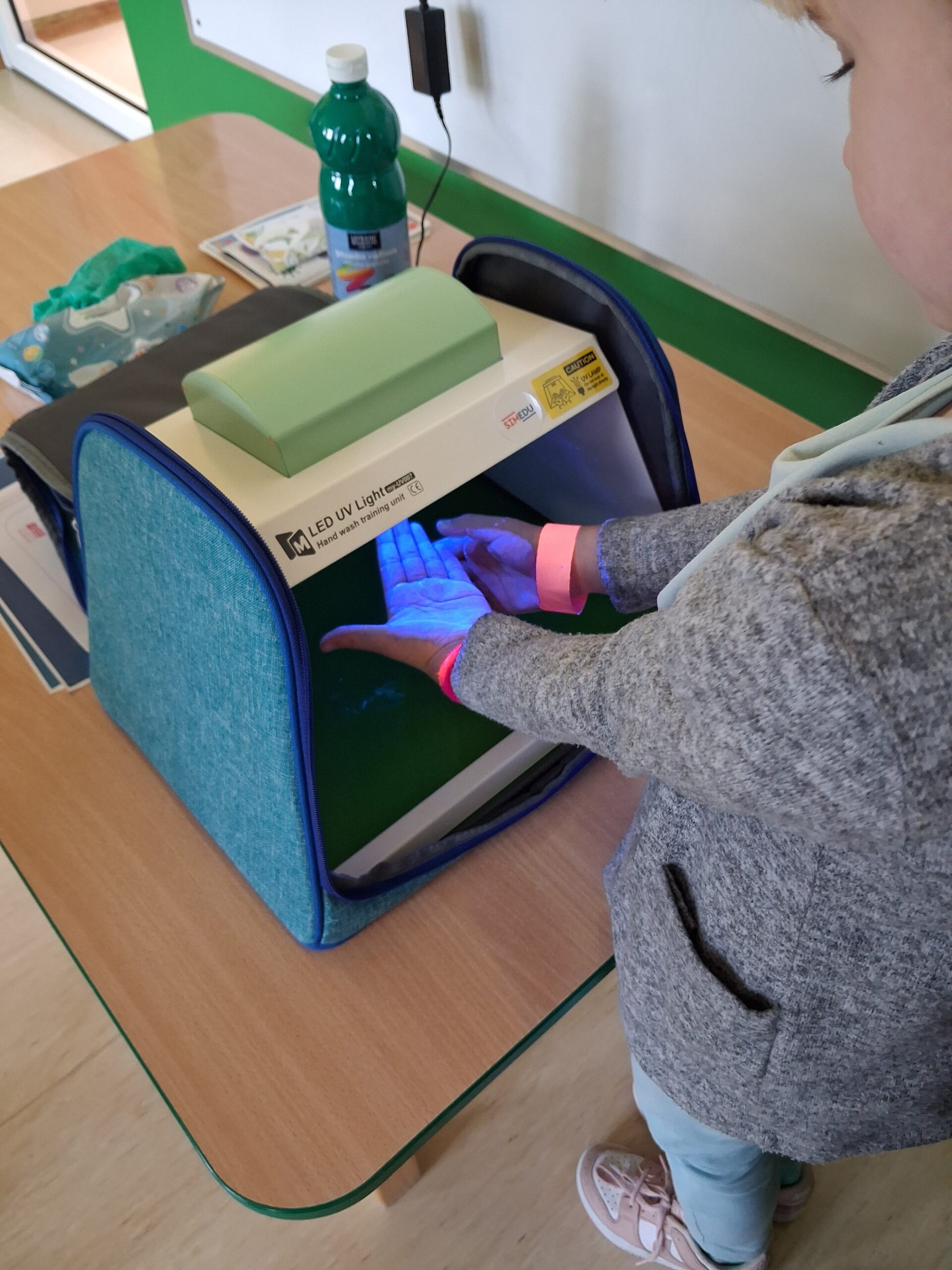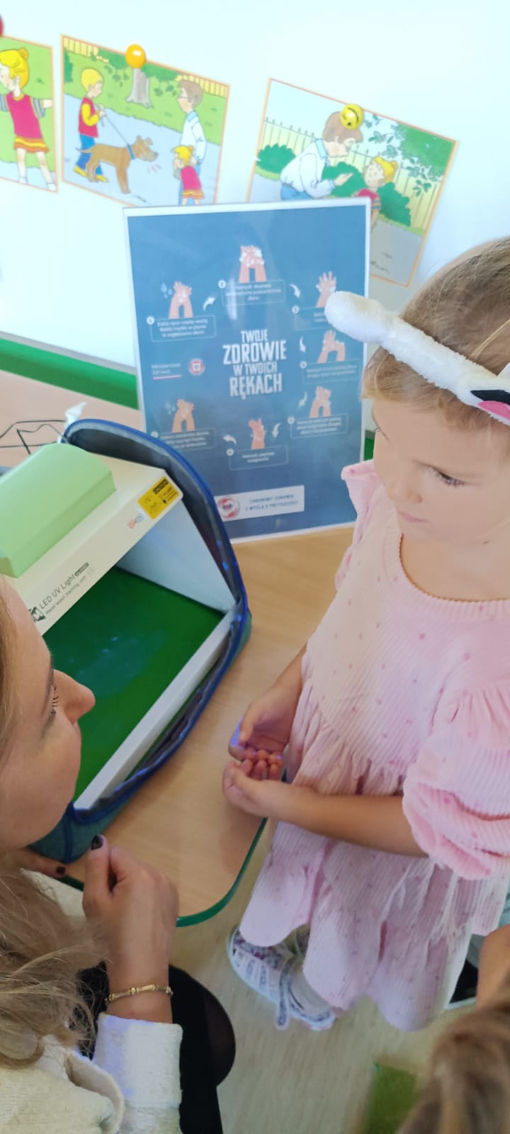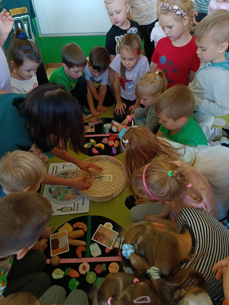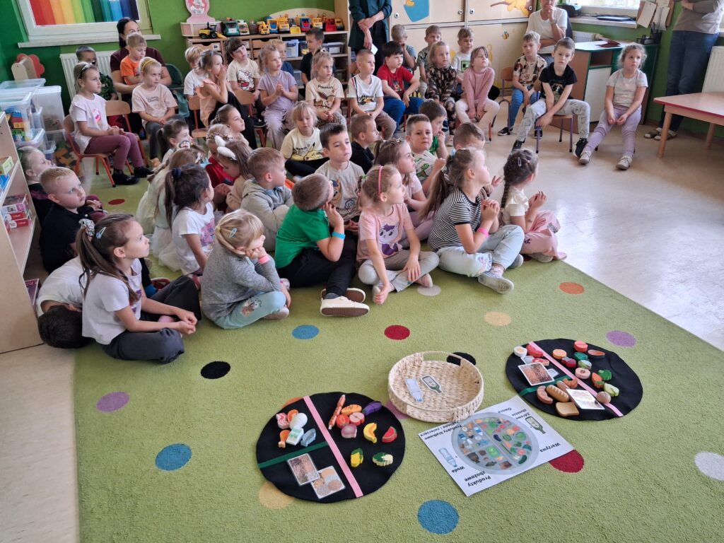 14 listopada dzieci z grup starszych uczestniczyły w zajęciach edukacyjnych przeprowadzonych przez Panie z sanepidu dotyczących higieny rąk oraz zdrowego żywienia. Dzieci miały okazję przypomnieć sobie jak prawidłowo myć ręce oraz sprawdzić- pod specjalną lampą czy zrobiły to dokładnie. To doświadczenie uświadomiło nam, jak starannie trzeba myć ręce, żeby usunąć z nich bakterie. Podczas spotkania, dzieci dowiedziały się także co to jest „Talerz zdrowego żywienia”, dlaczego należy się zdrowo odżywiać, spożywać owoce, warzywa, pełnoziarniste produkty zbożowe oraz białko i tłuszcze. Serdecznie dziękujemy za ciekawe i pouczające spotkanie.