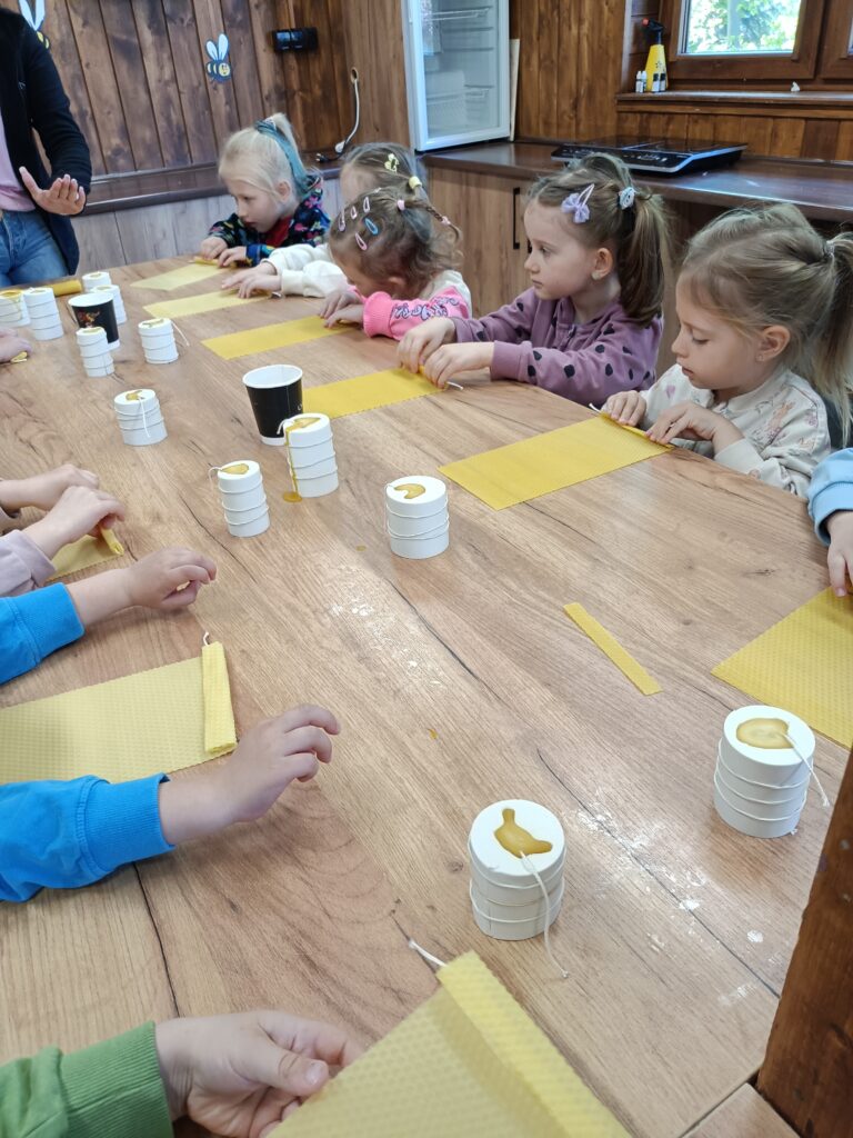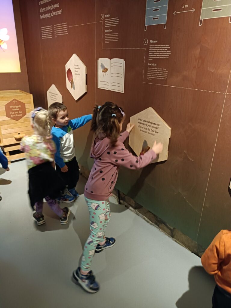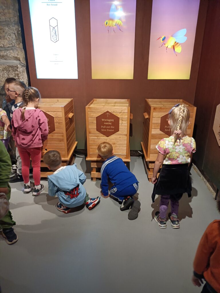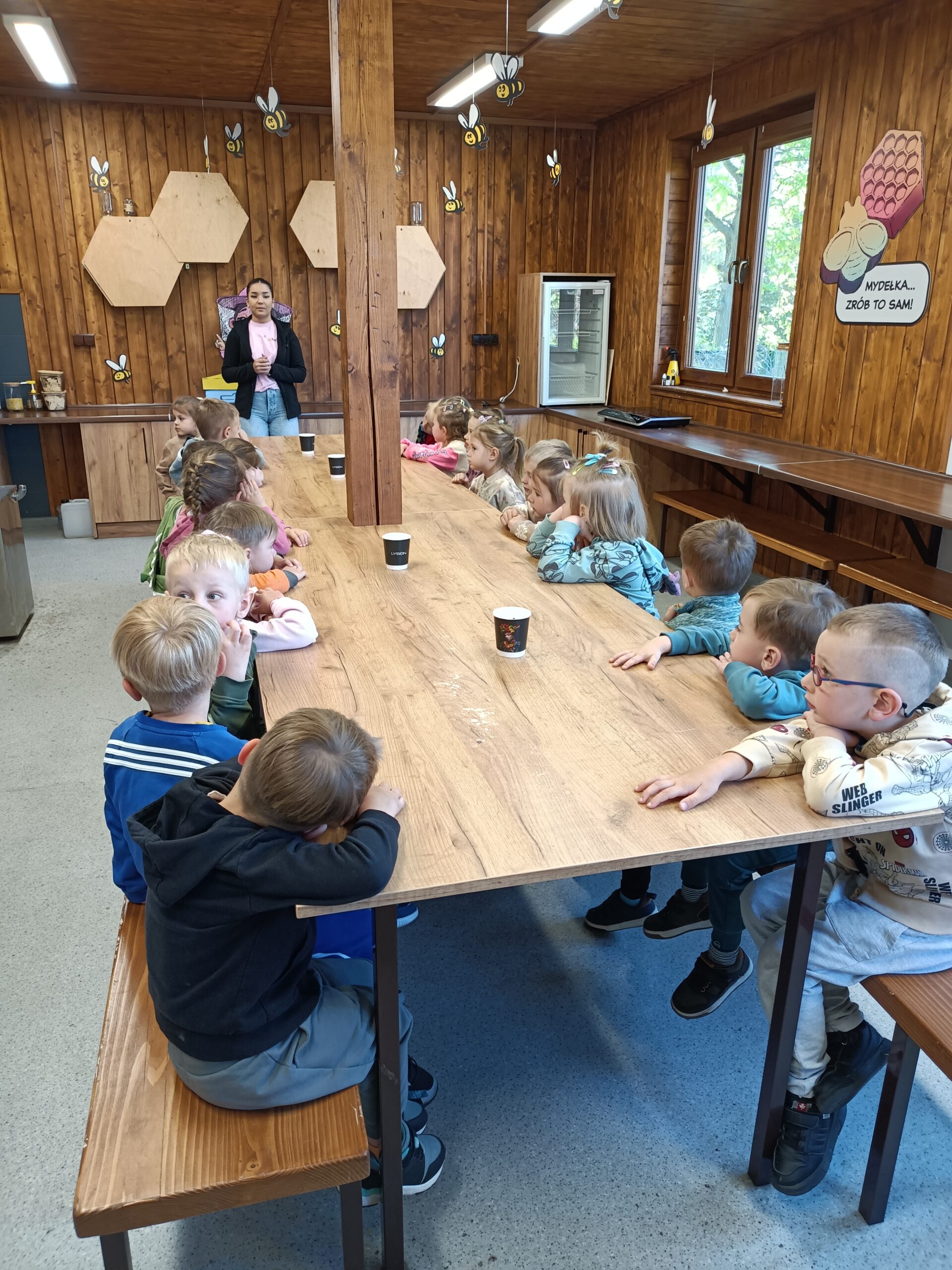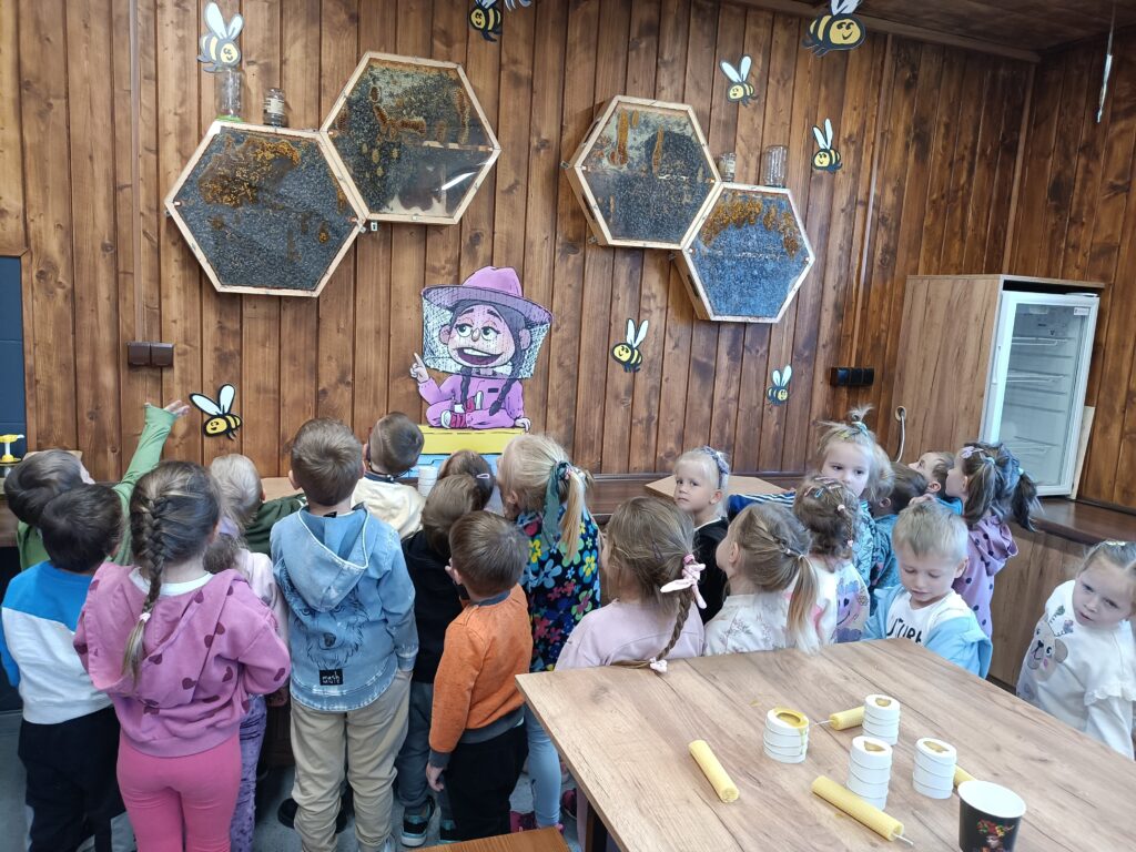 Przedszkolaki z grupy IV wyjechały na wycieczkę do „Apilandii”, aby odkryć największe tajemnice świata pszczół. Podczas zwiedzania dzieci dowiedziały się m.in. kto mieszka w ulu, jak wygląda życie pszczół, jakie dobrodziejstwa zawdzięczamy pszczołom oraz jak wygląda praca pszczelarza. Dzieci uczestniczyły także w warsztatach pszczelarskich i wykonały świecę z wosku lanego oraz z węzy pszczelej, degustowały produkty pszczele- pyłek i miód oraz obserwowały pszczoły w przeszklonym ulu- udało nam się nawet odnaleźć królową.