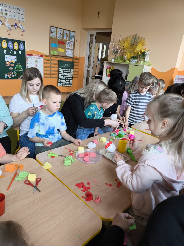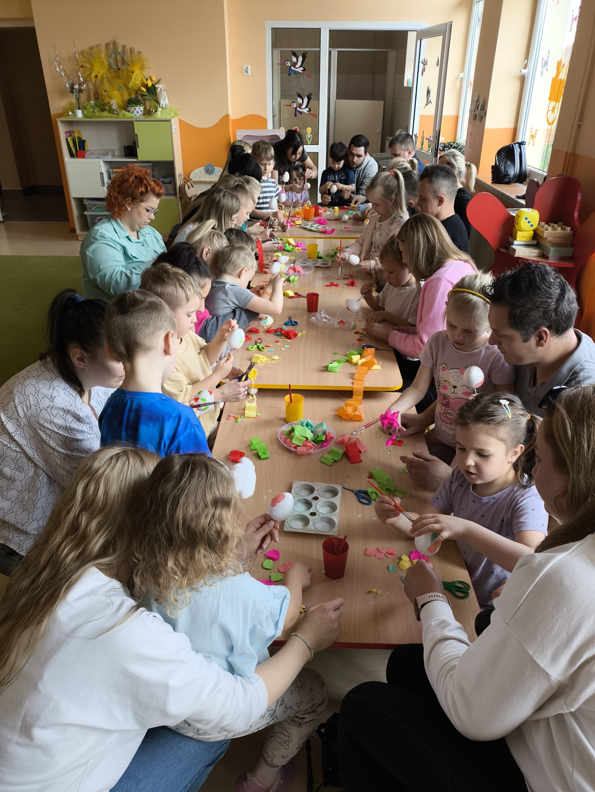 8 kwietnia na zajęcia otwarte do grupy V przyszli bardzo ważni goście – rodzice dzieci. Tematem zajęć były zbliżające się Święta Wielkanocne. Rodzice mieli możliwość zobaczyć jak wyglądają zajęcia w przedszkolu, jak również wykonać z dziećmi pisankę wielkanocną.